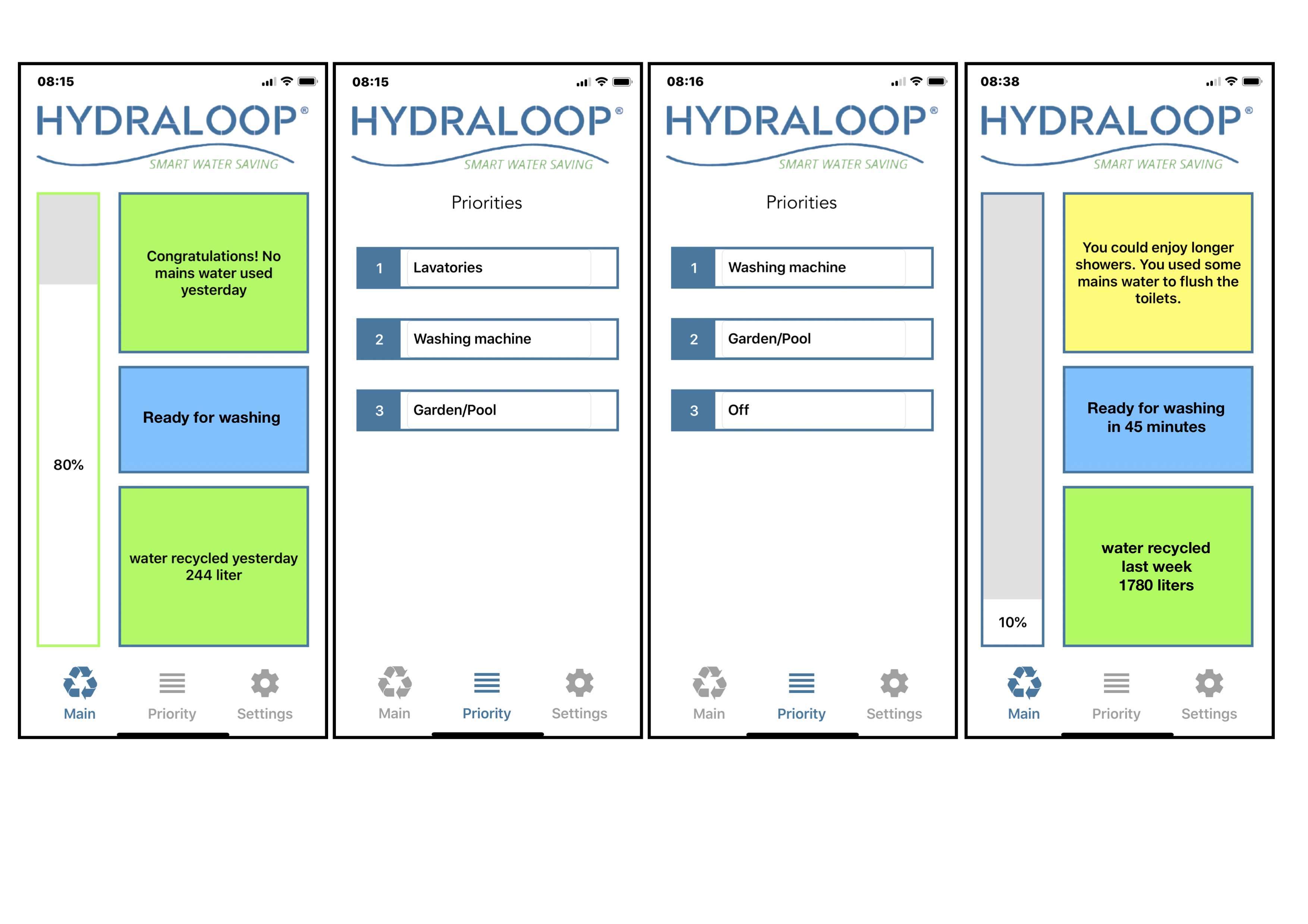 Vsak Hydraloop system ima vgrajeno opremo in program, ki kontinuirno nadzoruje in upravlja s sistemom. Povezan je z vašim domačim brezžičnim omrežjem. Sistem deluje popolnoma avtomatsko brez uporabnikovega posredovanja. Po želji pa lahko uporabnik optimira prihranek vode s preverjanjem v aplikaciji. Pri Hydraloop Xtra pa lahko v aplikaciji dodatno izbiramo prioritete za uporabo reciklirane vode.